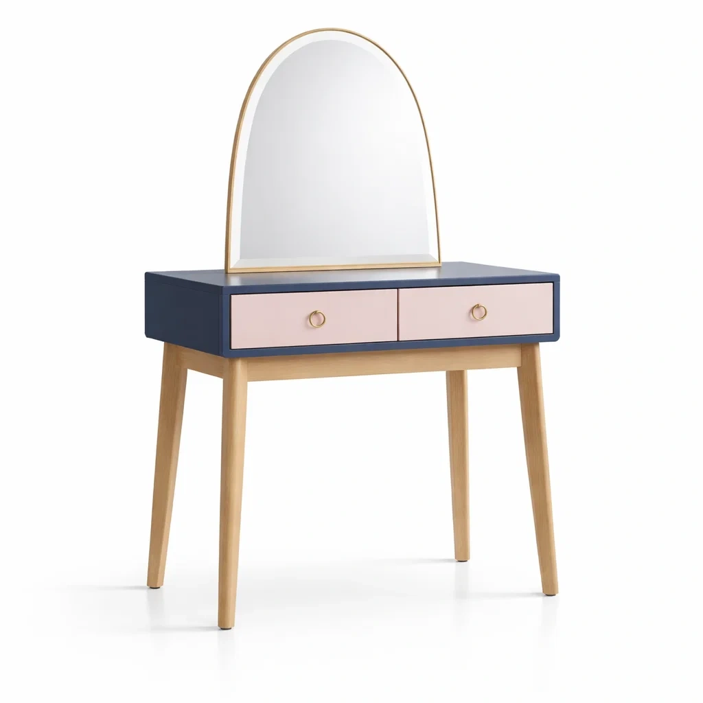 Coiffeuse en bois mdf et hêtre avec miroir courbé et tiroirs bleu et rose