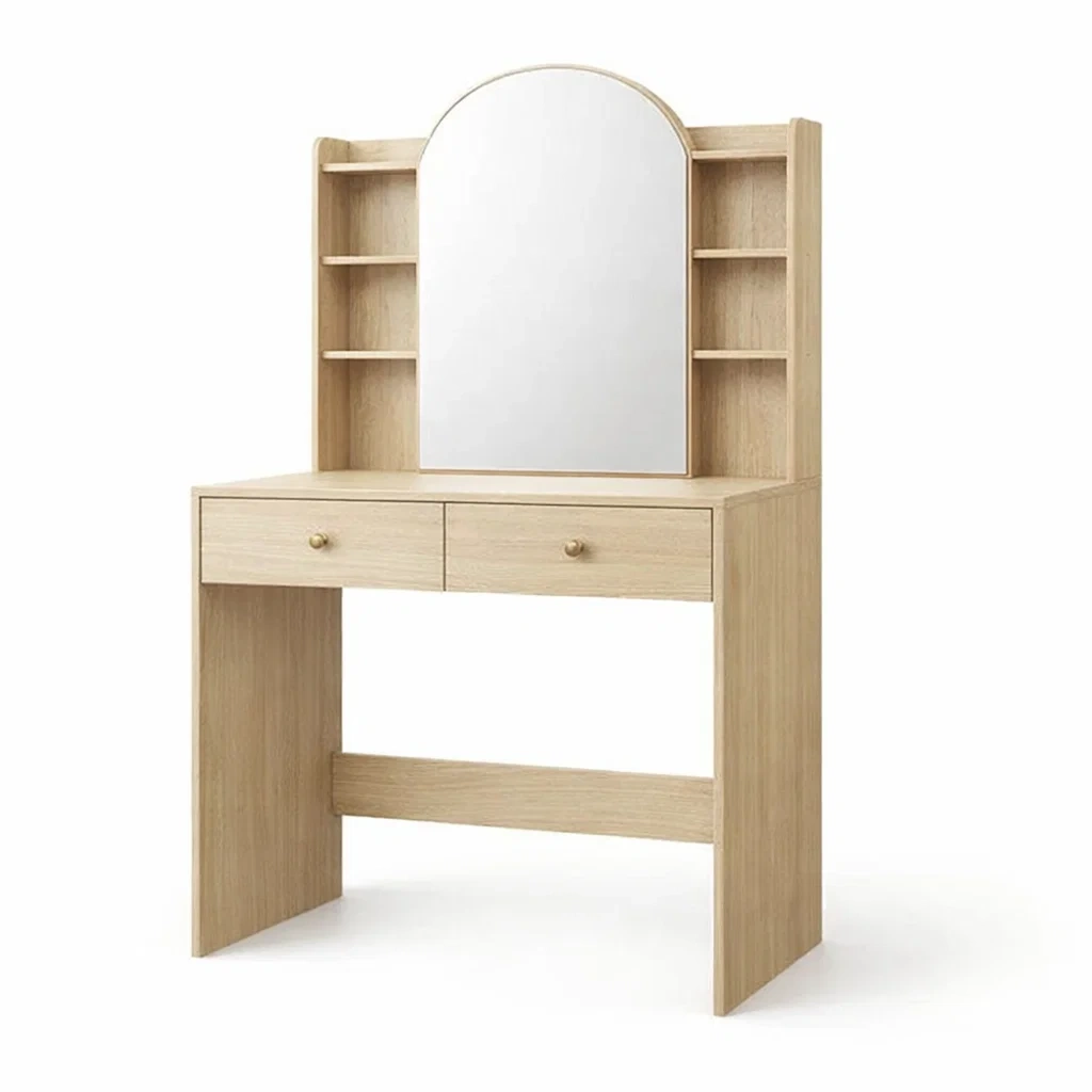 Coiffeuse avec miroir en verre argenté, cadre en bois MDF avec finition chêne. Dimensions : longueur 80 cm, largeur 40 cm, hauteur 140 cm. Comprend deux tiroirs pour le rangement et des étagères latérales.